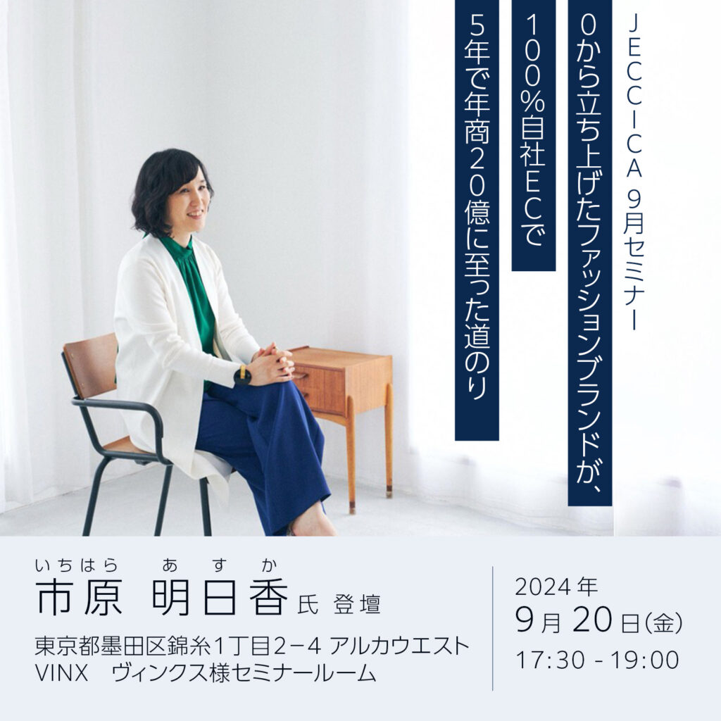 JECCICA9月セミナー 0から立ち上げたファッションブランドが、100%自社ECで5年で年商20億に至った道のり 市原明日香さん登壇 ■目的 モデラート株式会社 代表取締役 市原明日香(いちはら あすか)さんの女性な […]