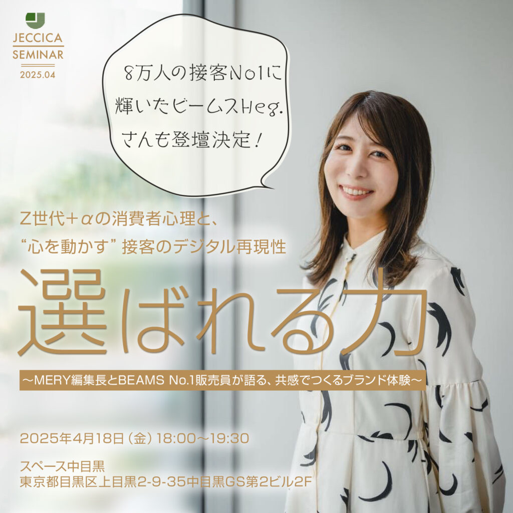 JECCICA 4月セミナー 8万人の接客No1に輝いたビームスHeg.さんも登壇決定! 選ばれる力 ─ Z世代+αの消費者心理と、“心を動かす”接客のデジタル再現性 〜MERY編集長とBEAMS No.1販売員が語る、共感でつくるブランド体験〜