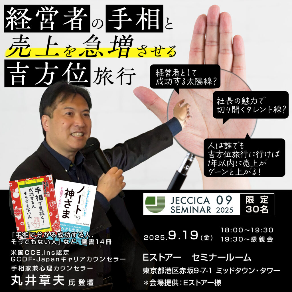 JECCICA9月セミナー 手相で売上を急増させる吉方位セミナー 講師は14冊出版・多数メディア実績のある人気鑑定士が登壇!