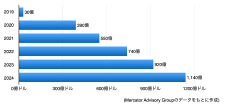 ところでBNPLサービスの人気が高まるにつれ、その貸付額は上昇し、次のグラフからわかるように、アメリカでは2019年のBNPL貸付額は30億ドルでしたが、2021年には550億ドルに、2024年には1,140億ドルに達するだろうと予測されています。