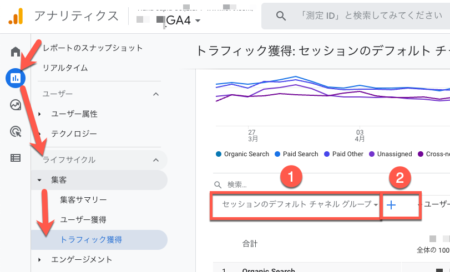 答えは、「GA4で、レポート>ライフサイクル>集客>トラフィック獲得 と進み、下図のように設定してください」です。