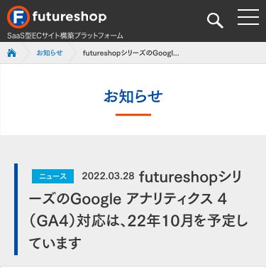 futureshopシリーズのGoogle アナリティクス 4(GA4)対応は、22年10月を予定しています