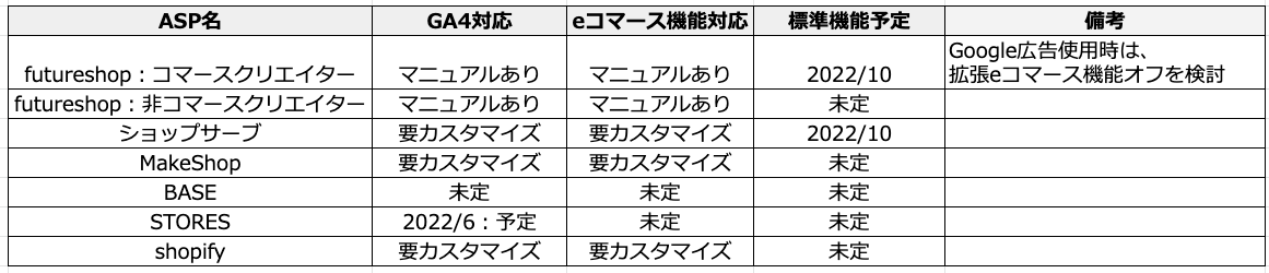 各社Googleタグマネージャが実装できるASPの場合、タグのカスタマイズで実装が可能、という状態です。ただし各社カスタマイズで実装可能な場合でも、前号でお伝えしたとおり利用環境によってはうまく稼働しないケースもありますので導入後も検証が必要です。また、タグマネージャを使わずに標準機能で実装可能を公表されているのは、futureshopさんとショップサーブさんのみとなっています。STORESさんが管理画面上でのみGA4対応を告知されていましたが詳細の記載はなく確認中です。