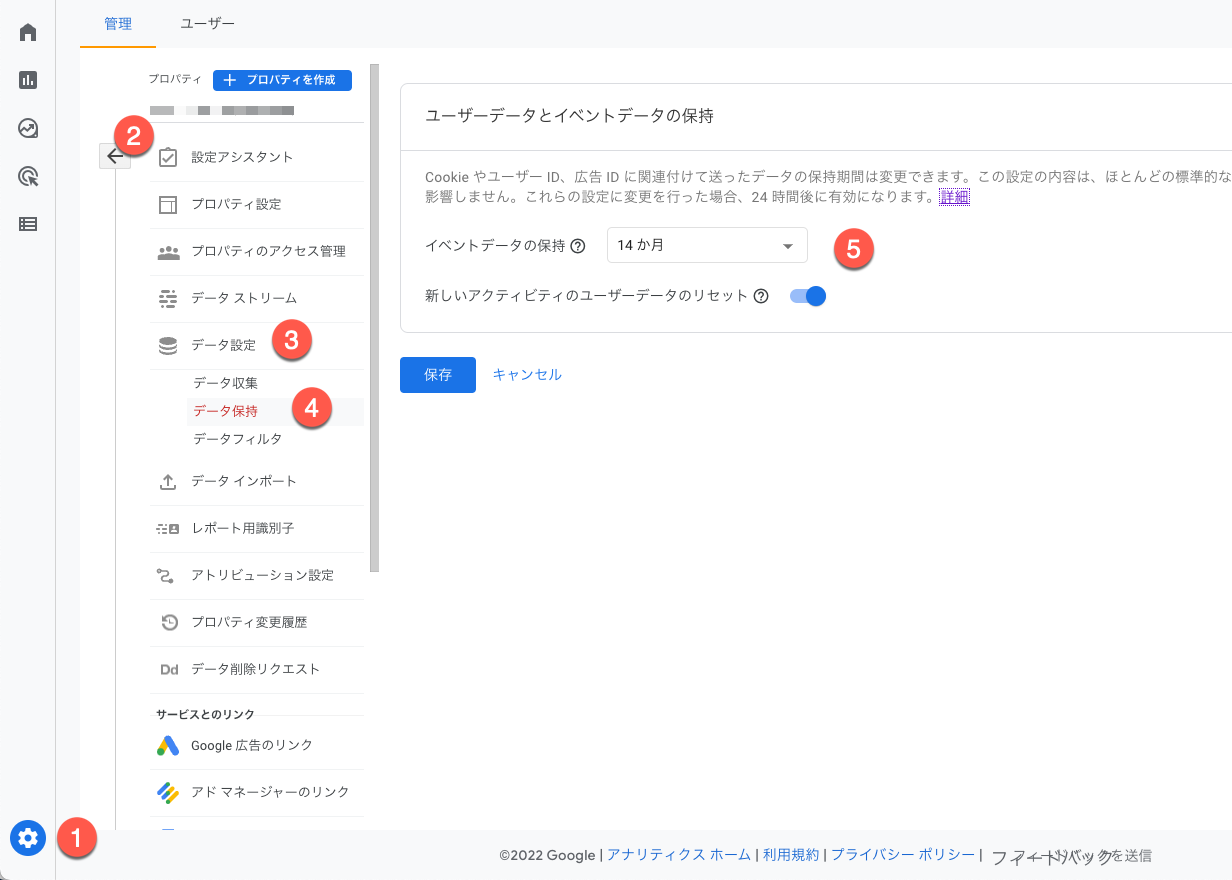 UAの時にも2018年に誤解も相まって炎上した本件ですが、GAの主なレポートが削除されるわけではありません。ユーザエクスプローラなどのユーザ単位やイベント単位のデータが、デフォルトだと2ヵ月しか保持できないので、多くのECでは以下の手順で「14ヵ月」に設定しておきましょう。