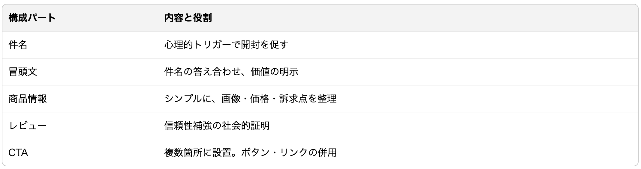 逆に、件名で訴求した内容と本文の構成が一致していれば、読者はスムーズに次のアクション──商品ページの閲覧や購入へと進んでくれます。