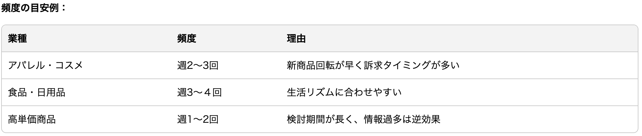 ABテストや定点観測による頻度調整が重要です。週1と週2での開封率・CTR・解除率の変化を比較し、自社の最適解を探りましょう。