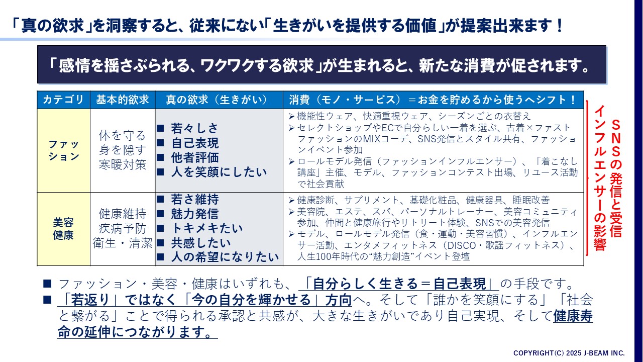 これからのマーケティングに求められるのは、「不安を解決する、減らす」ことだけではなく、「生きがいを増やす」ことです。生きがい消費は、人を動かし、外に連れ出し、つながりを生み、不安に感じることを減らし、その結果として健康寿命を延ばします。