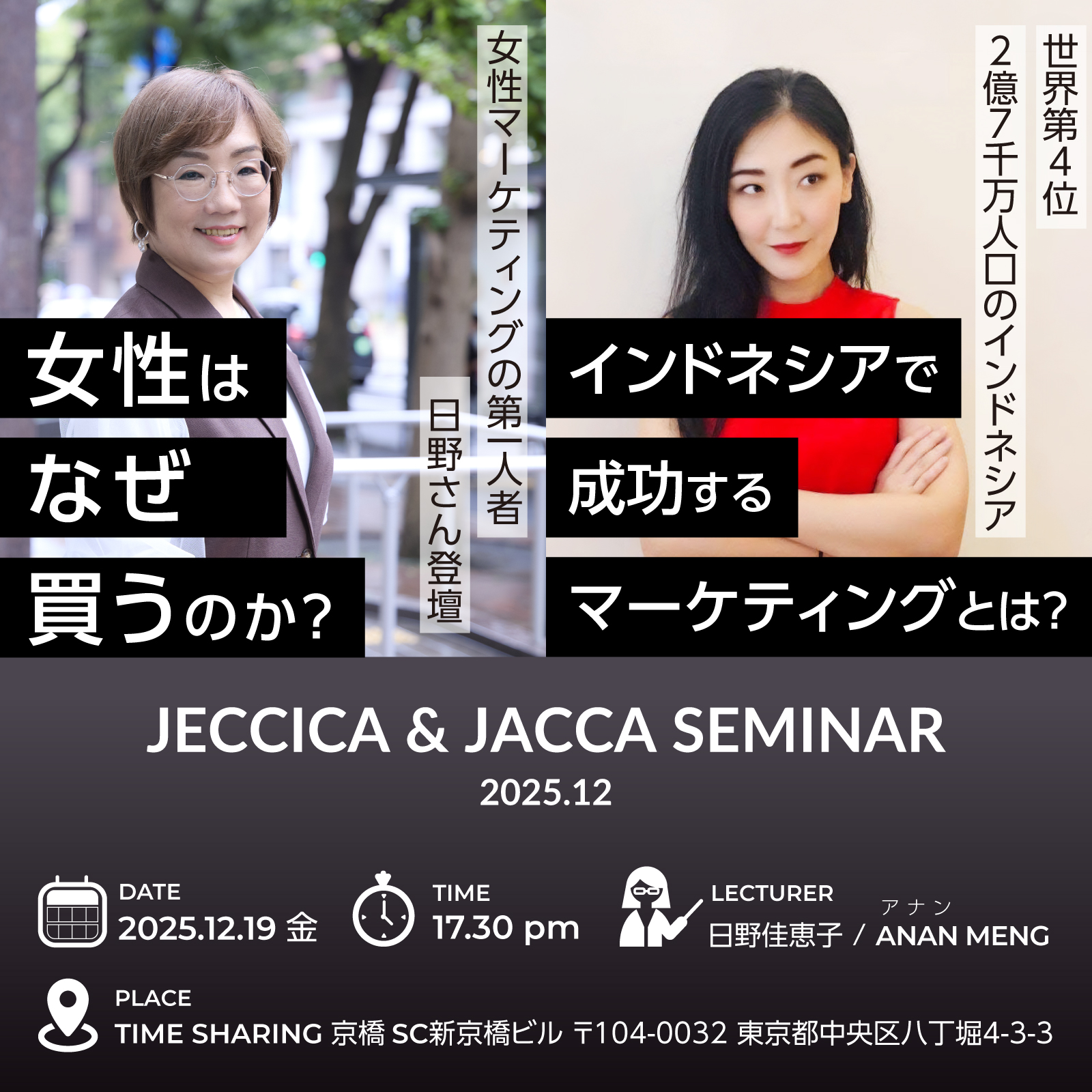 JECCICA&JACCA共催12月セミナー 女性マーケティングの第一人者 日野さん登壇 女性はなぜ買うのか? & 世界第4位 2億7,000万人口のインドネシア TikTok Shopのリアル インドネシアのEC事情 成功するマーケティングとは?