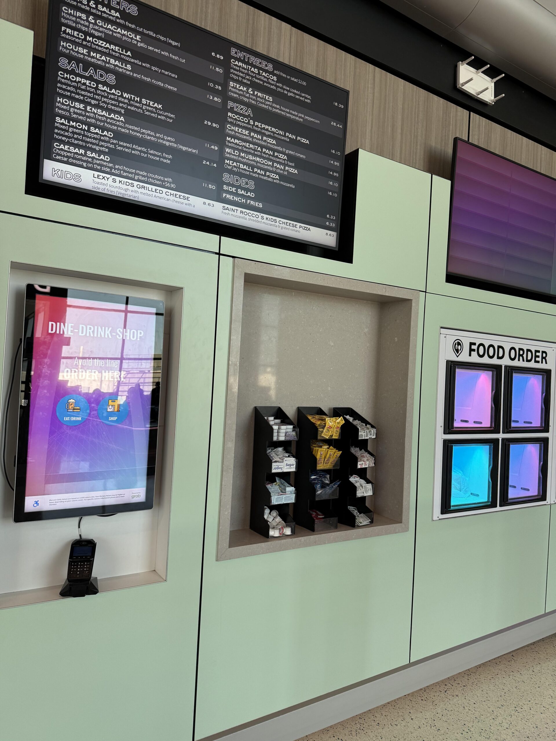 またダラス空港では、オンラインでフードをオーダーしてゲートまで届けてくれるサービスや、キオスクでオーダーしてフードをピックアップボックスから受け取るシステムもあり、空港がまさしく日常生活のように機能しています。この手の最先端テクノロジーの利用は、シリコンバレーが進んでいると思っていましたが、空港に関して見ると、どうもそうではないようです。